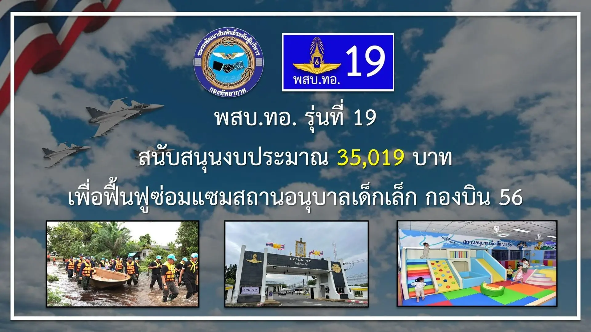 เมื่อวันที่ 8 ธันวาคม 2568 เวลา 11.00 น. ผู้แทน พสบ.ทอ. รุ่นที่ 19 ได้มอบเงินสนับสนุนงบประมาณจำนวน 35,019 บาท เพื่อใช้ในการปรับปรุงและซ่อมแซมสถานอนุบาลเด็กเล็ก กองบิน 56 ที่ได้รับความเสียหายจากเหตุอุทกภัย โดยมี พลอากาศโท ประสิทธิ์ ดำรงค์ปรีชา เจ้ากรมกิจการพลเรือนทหารอากาศ พร้อมด้วยนายทหารชั้นผู้ใหญ่จากกรมกิจการพลเรือนทหารอากาศ เป็นผู้รับมอบ เพื่อช่วยฟื้นฟูสภาพแวดล้อมให้กลับมาเอื้อต่อการดูแลและพัฒนาการของเด็กเล็ก