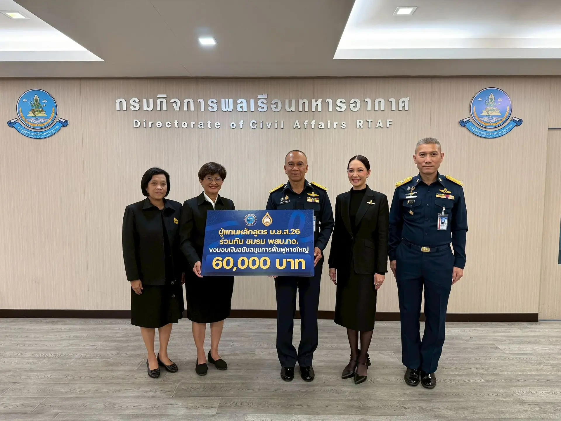 ผู้แทนหลักสูตรผู้บริหารกระบวนการยุติธรรมระดับสูง รุ่นที่ 26 (บยส.26) ร่วมกับผู้แทนหลักสูตรพัฒนาสัมพันธ์ระดับผู้บริหารกองทัพอากาศ (พสบ.ทอ.) มอบเงินสนับสนุนจำนวน 60,000 บาท เพื่อสมทบทุนช่วยเหลือและฟื้นฟูพื้นที่ประสบอุทกภัยในอำเภอหาดใหญ่ จังหวัดสงขลา โดยมี พลอากาศโท ประสิทธิ์ ดำรงค์ปรีชา เจ้ากรมกิจการพลเรือนทหารอากาศ เป็นผู้รับมอบ